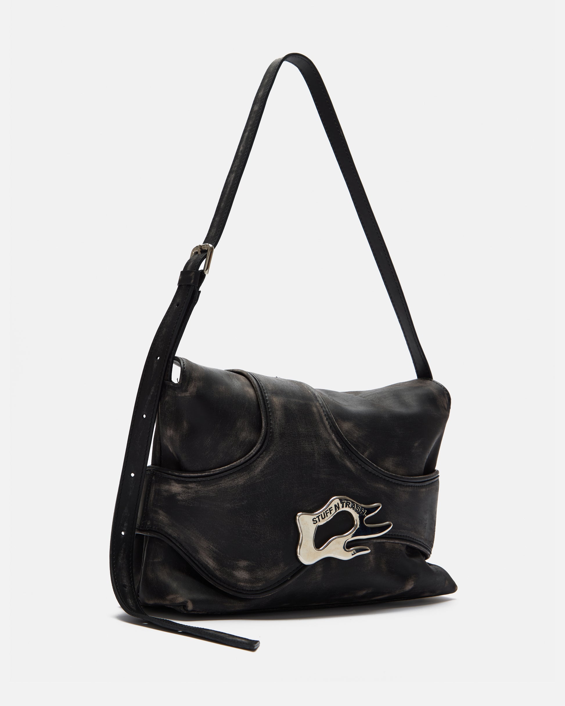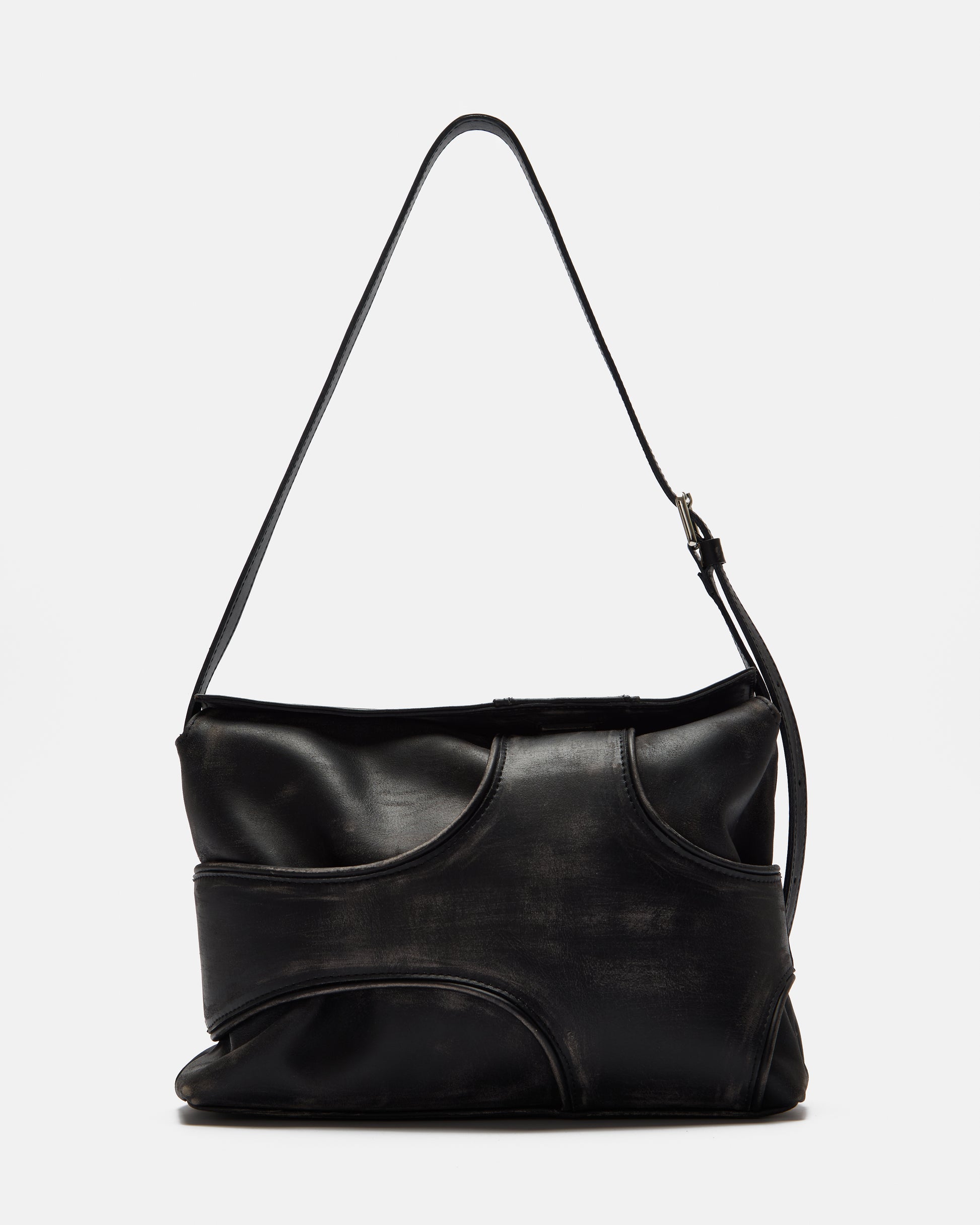 Axis Mid Bag made from black cowhide leather with a distressed finish. It has an adjustable strap with a metal buckle so it can be worn over the shoulder or across the body. It has a metal zip closure and the interior is lined with 100% cotton.