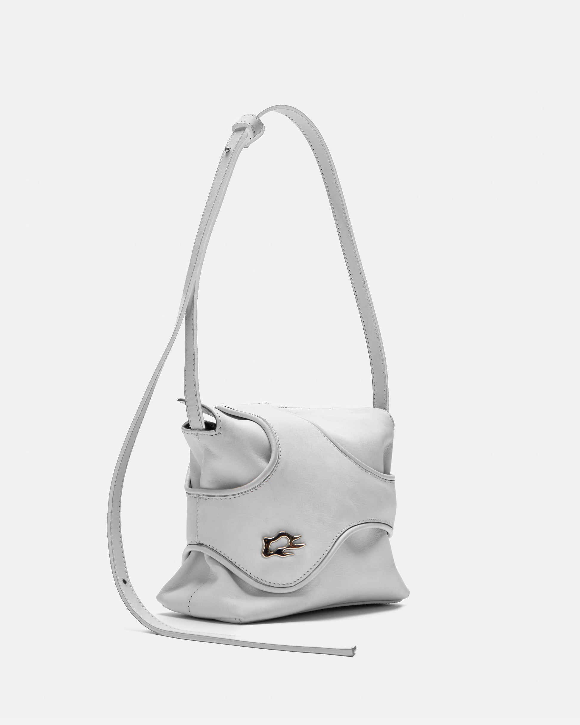 Axis Mini Bag made from white cowhide leather. It has an adjustable strap with a clasp so it can be worn over the shoulder or across the body. It has a metal zip closure and the interior is lined with 100% cotton.