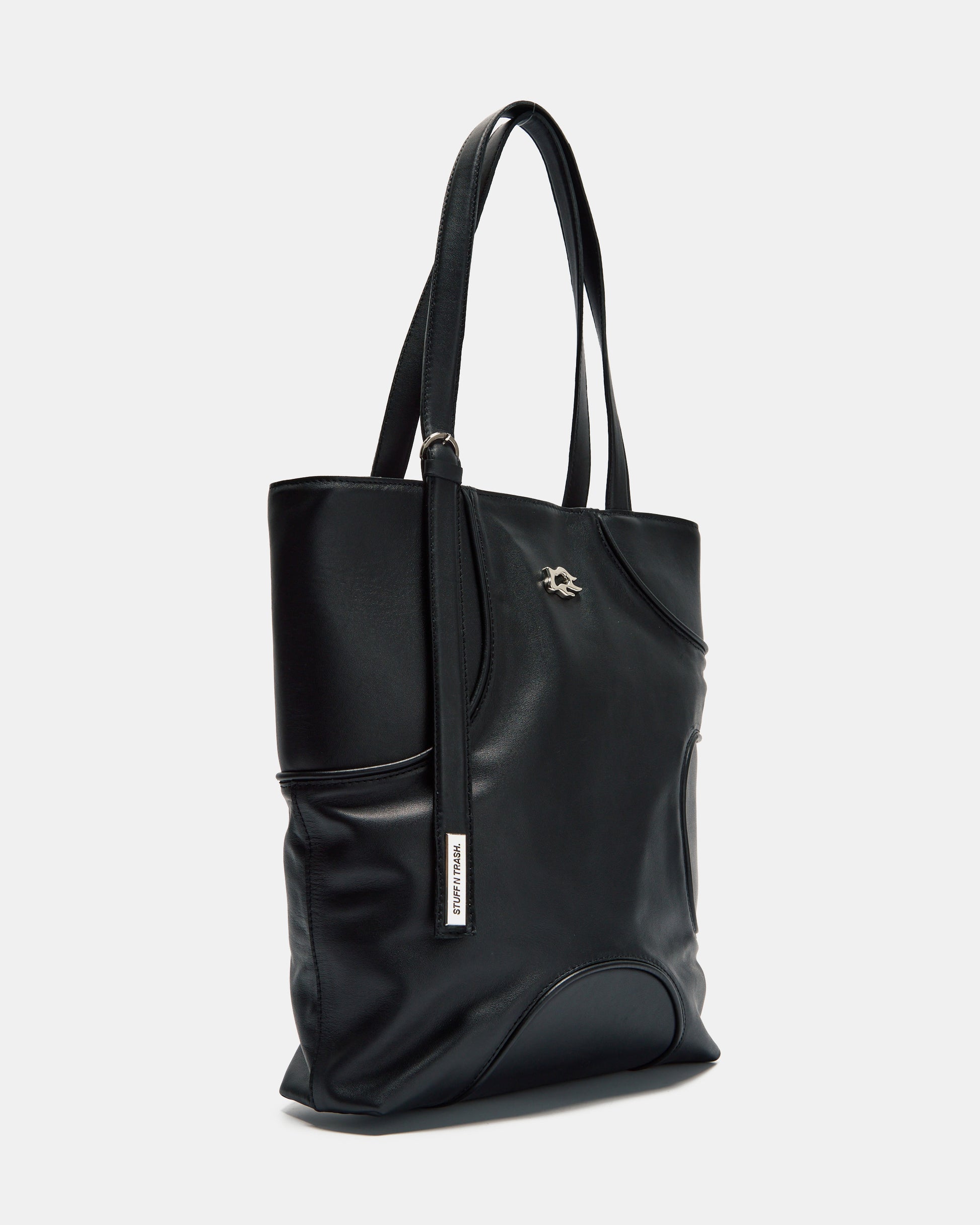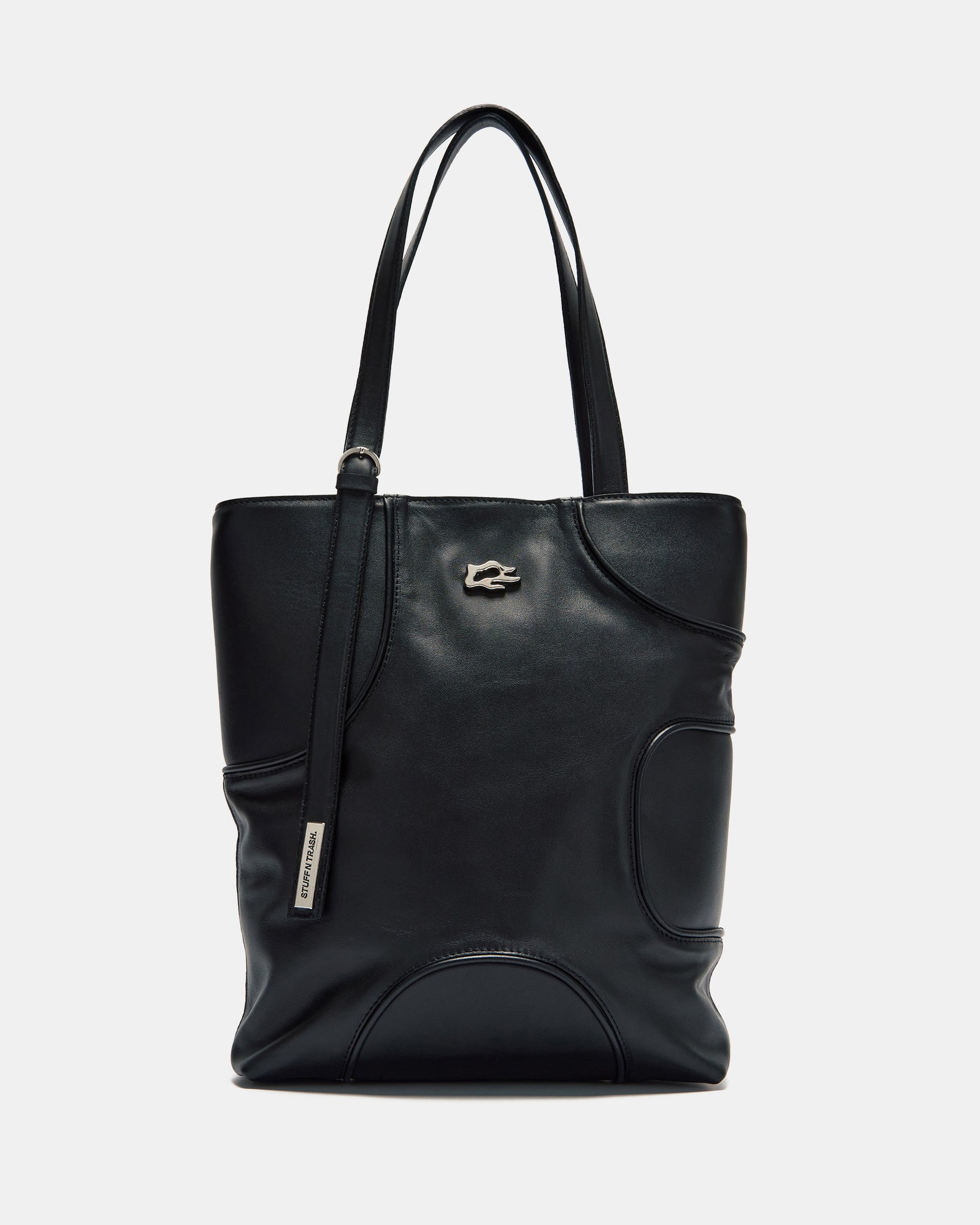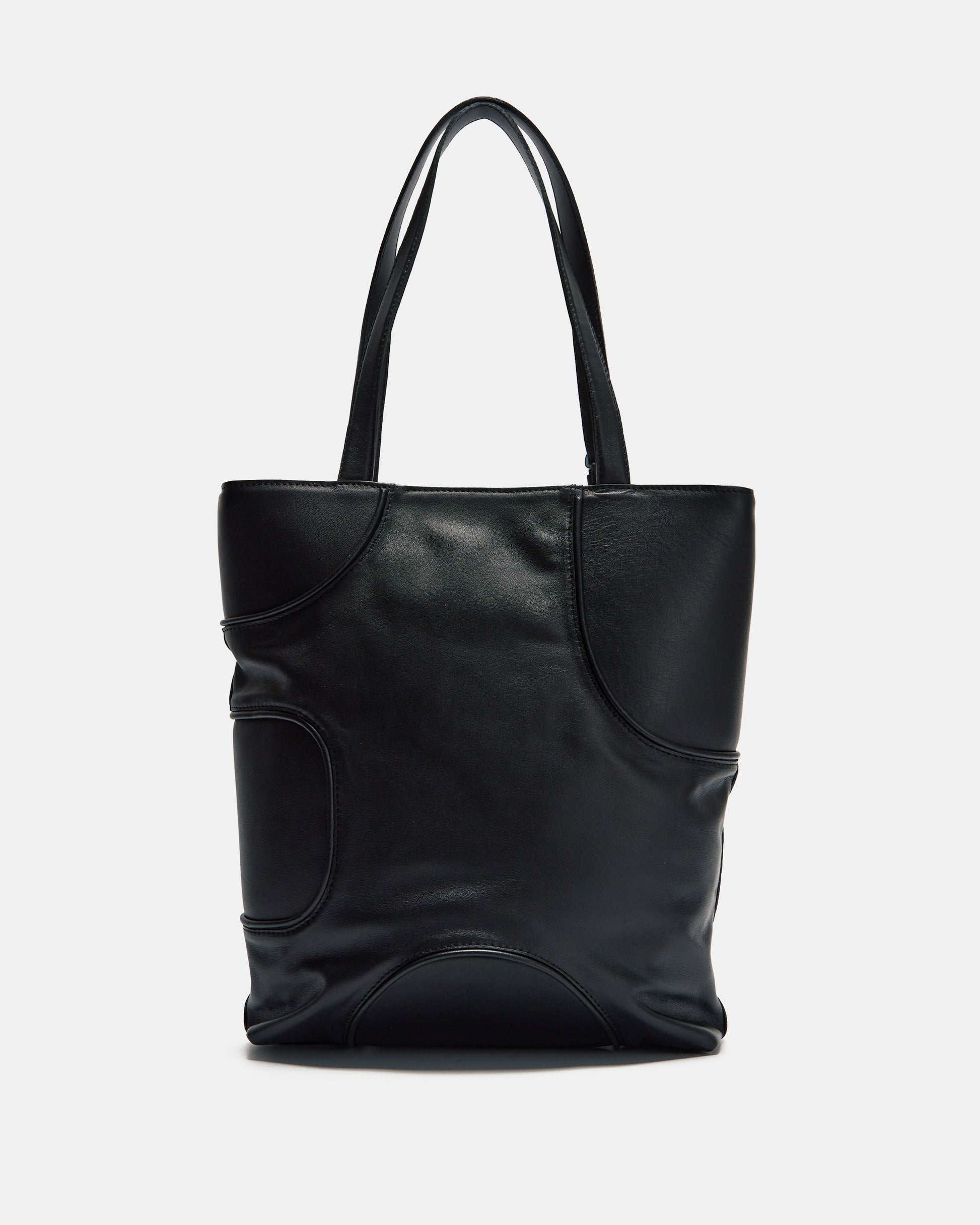 Introducing the Axis Tote Bag, crafted in black cowhide leather. Features rectangular shape with cutouts and handles. The interior is lined in 100% cotton with a zippered pocket.