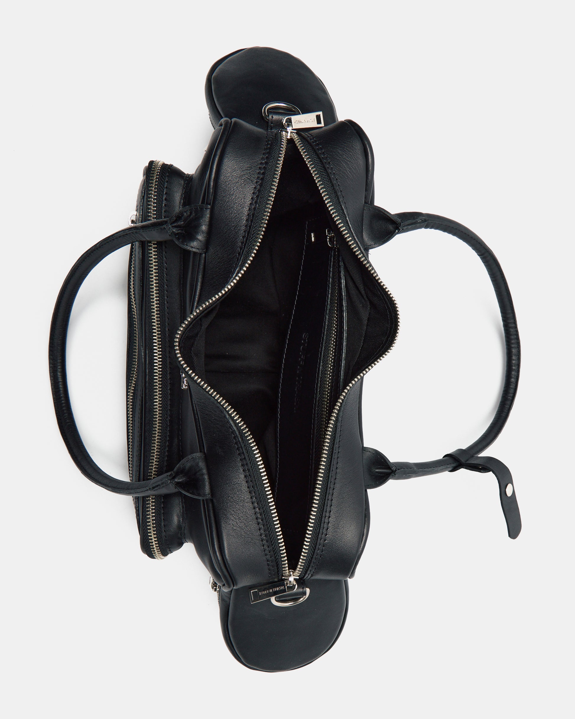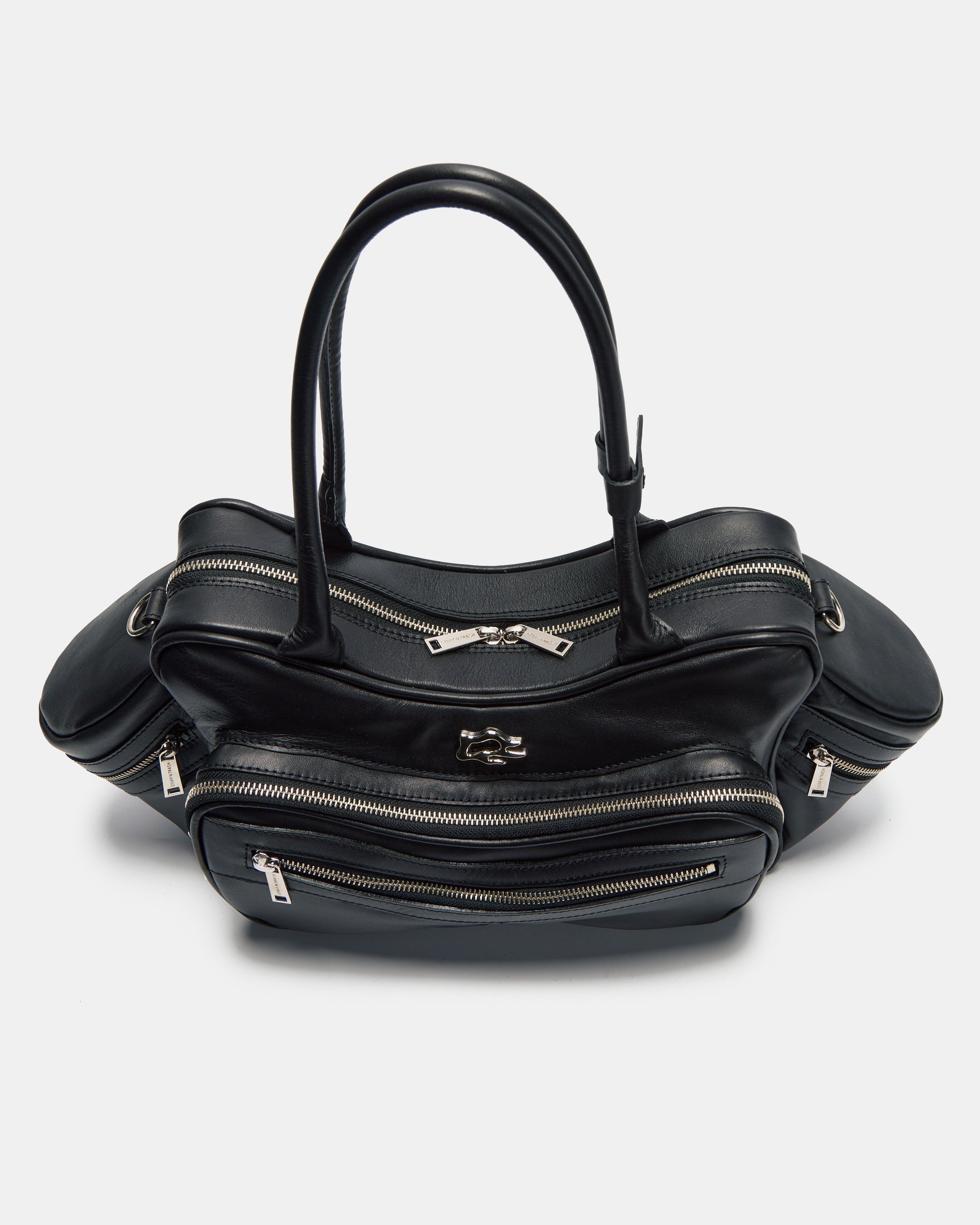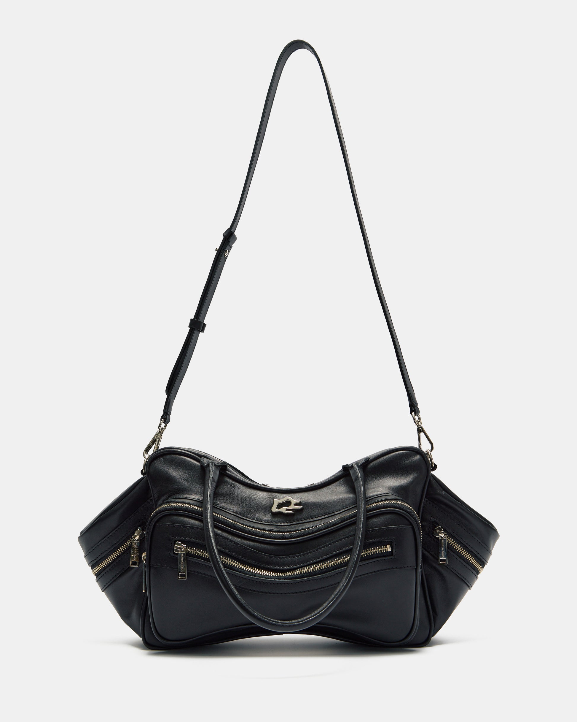 Tool Bag in black cowhide leather. Features multiple zip compartments on the front and sides. Shoulder handles and removable crossbody strap with metal carabiner for adjustment. The interior is lined in 100% black cotton and has a zippered pocket.