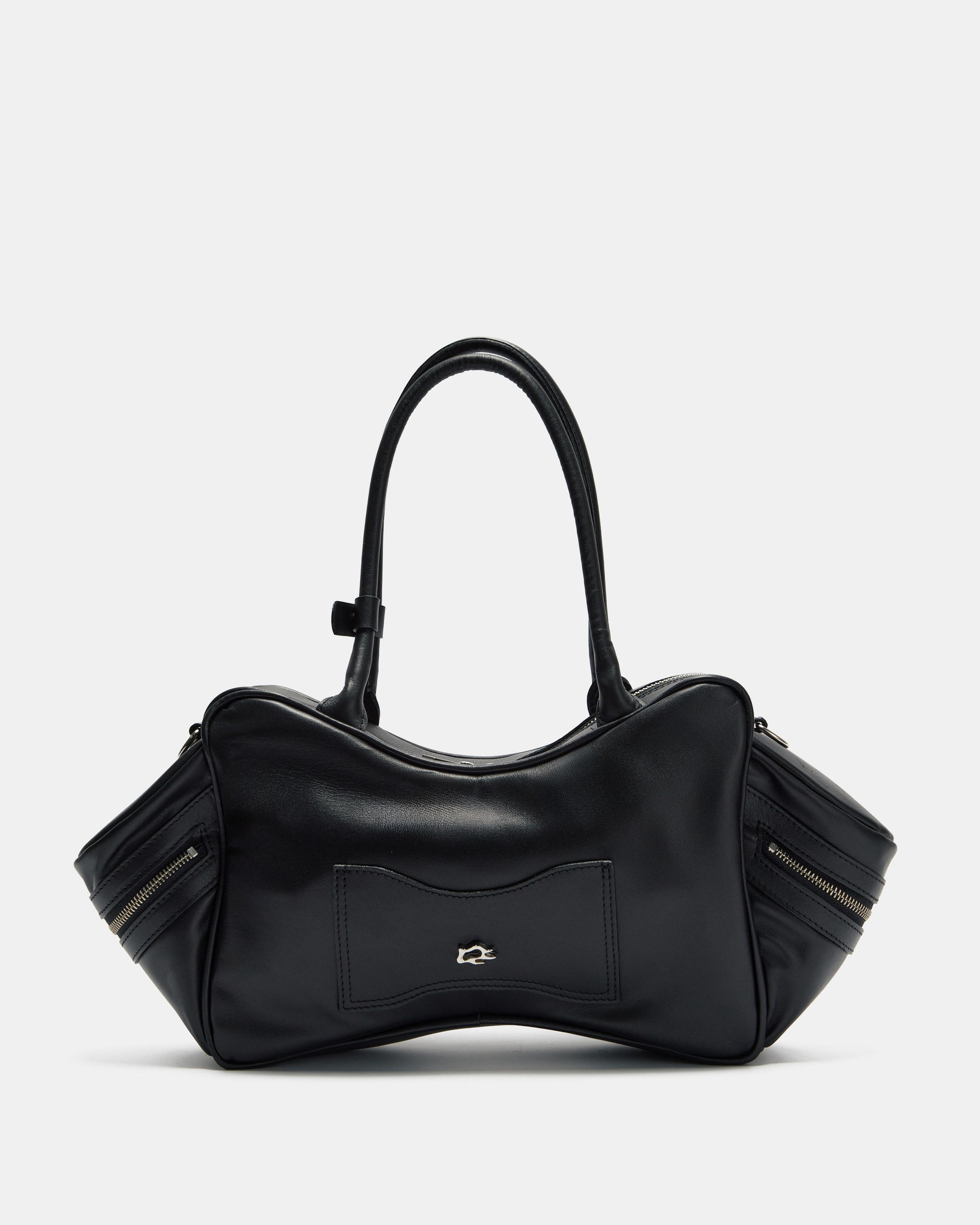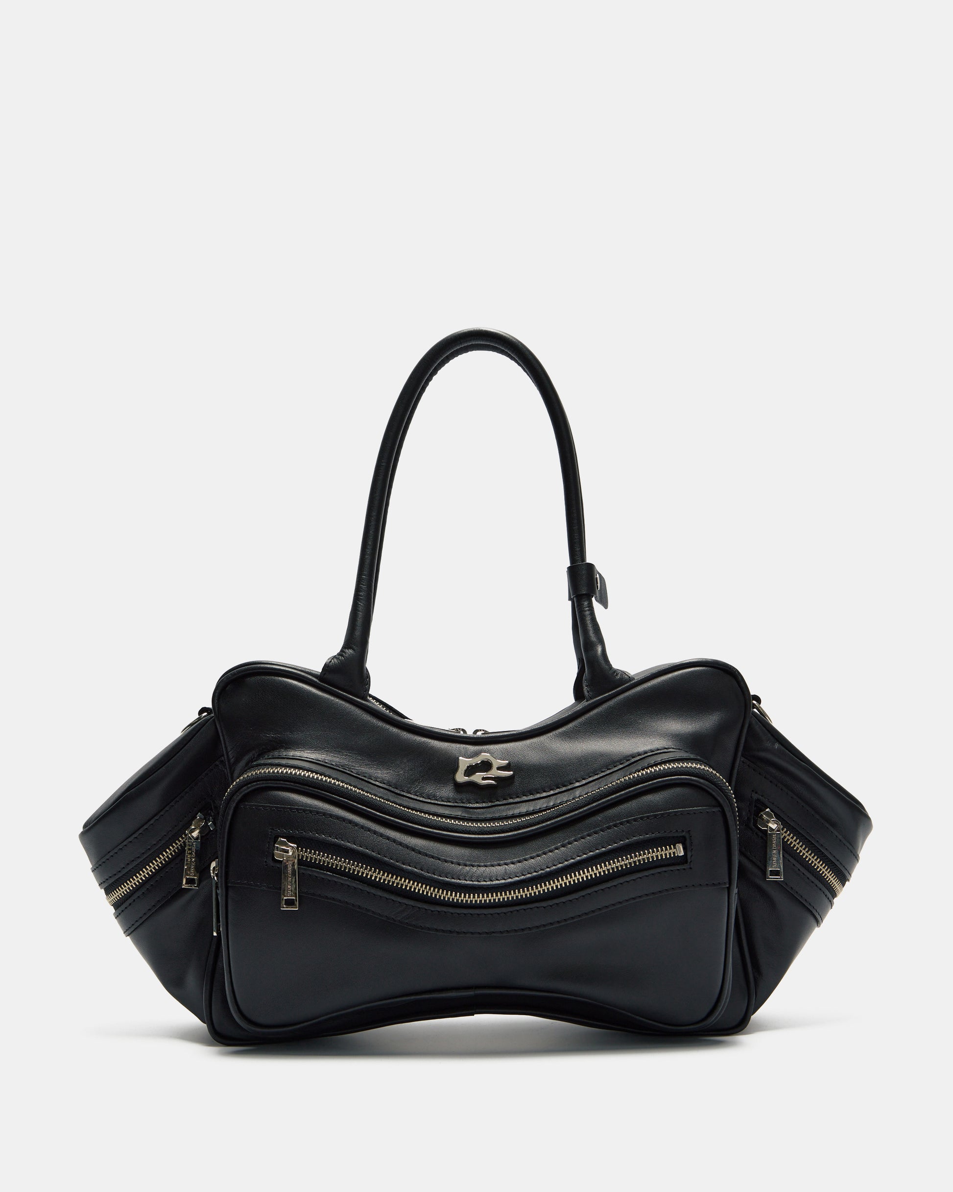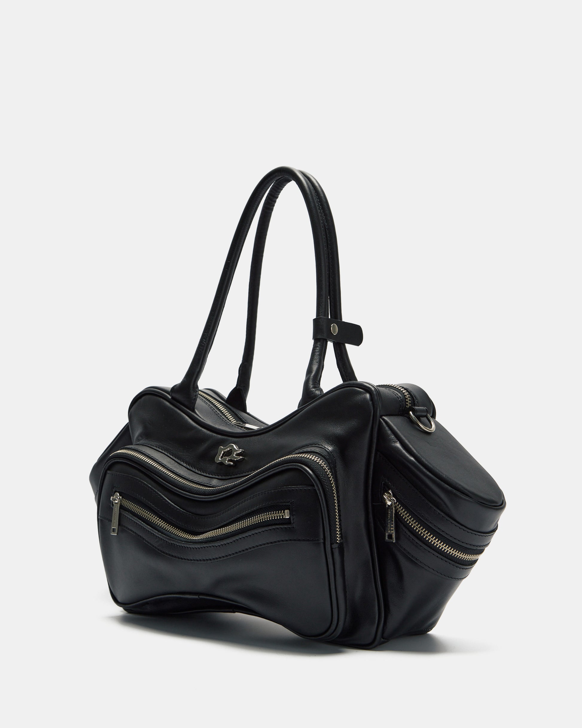 Tool Bag in black cowhide leather. Features multiple zip compartments on the front and sides. Shoulder handles and removable crossbody strap with metal carabiner for adjustment. The interior is lined in 100% black cotton and has a zippered pocket.