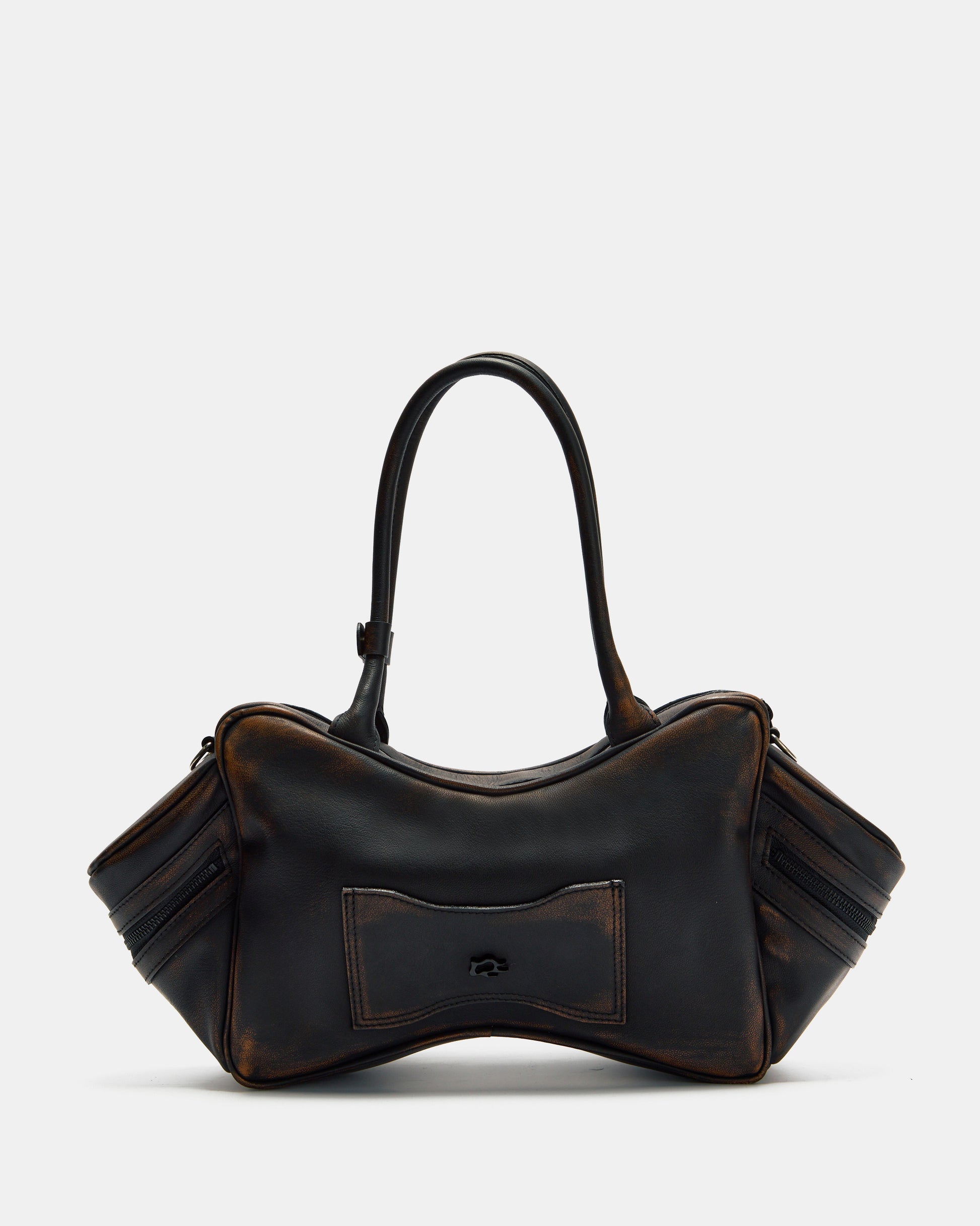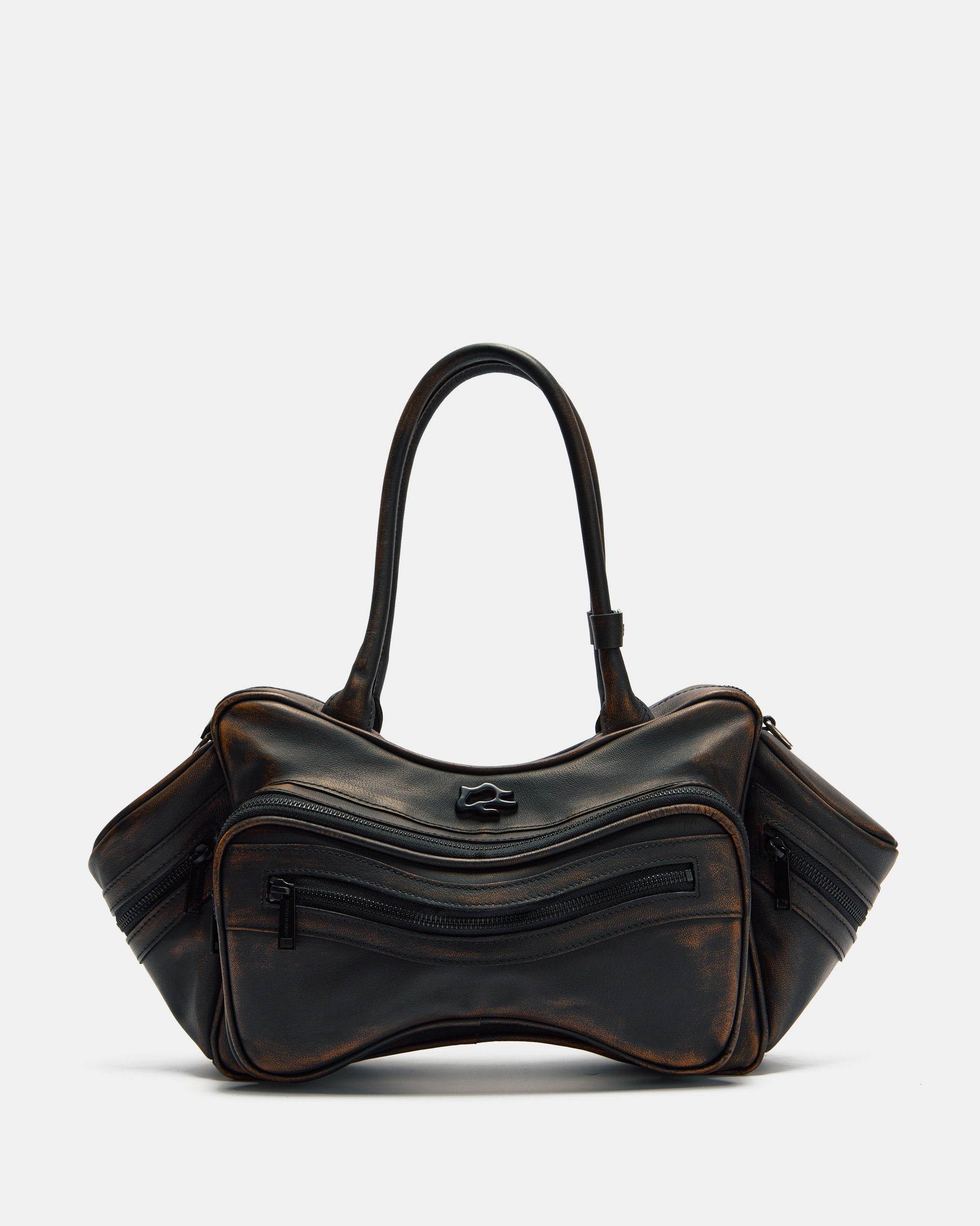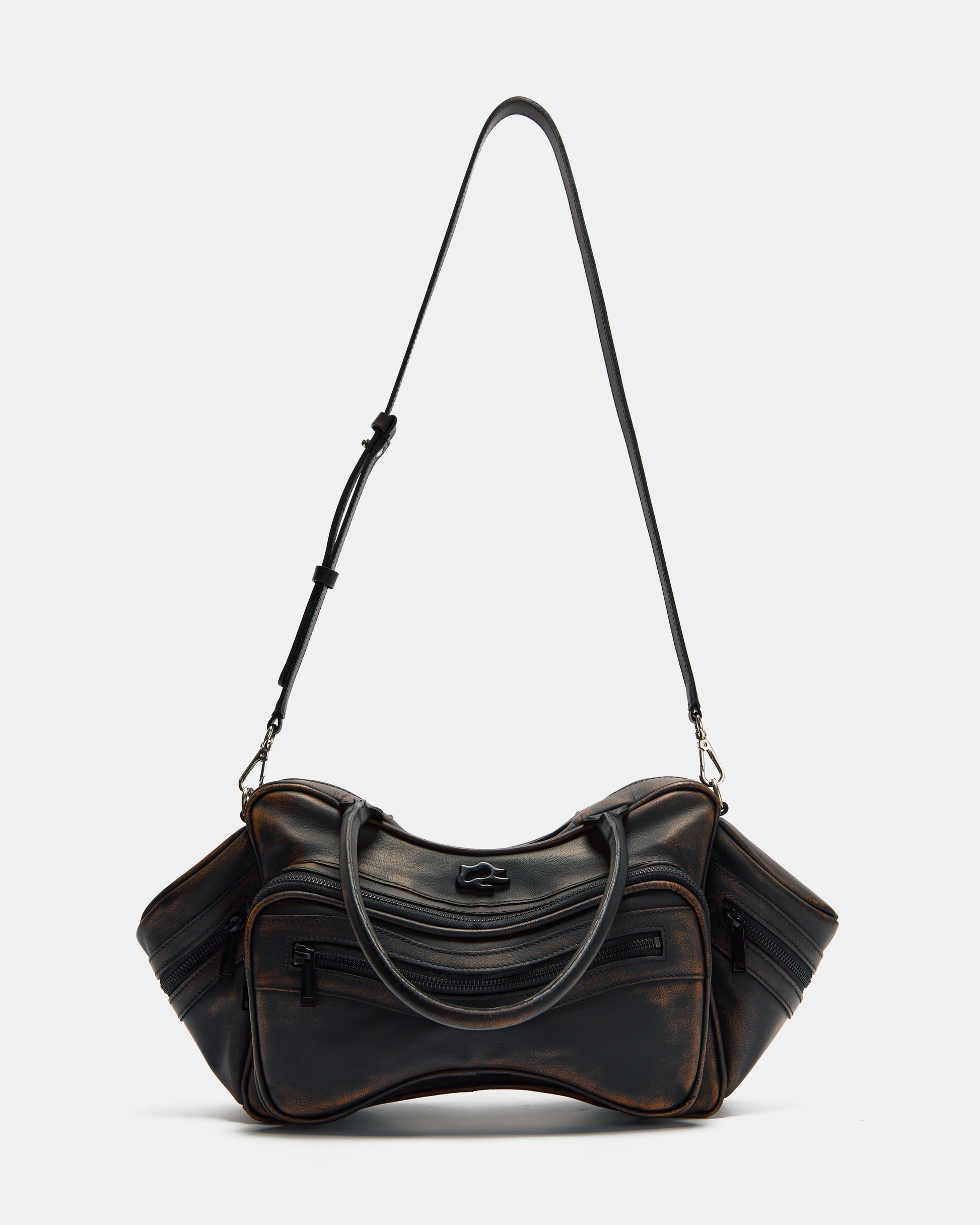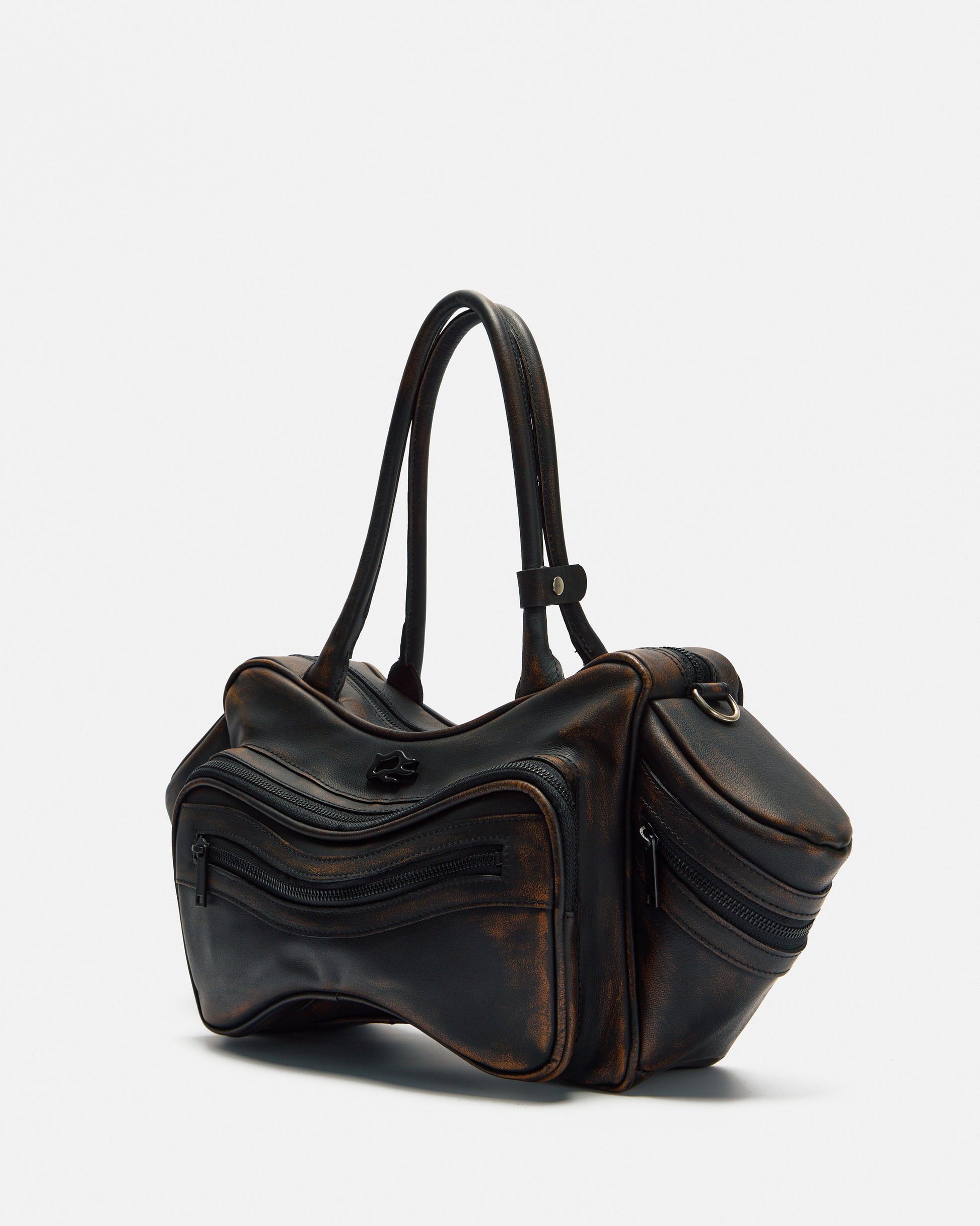 Tool Bag in black cowhide leather with tinted brown finish. Features multiple zip compartments on the front and sides. Shoulder handles and removable crossbody strap with metal carabiner for adjustment. The interior is lined in 100% black cotton and has a zippered pocket.