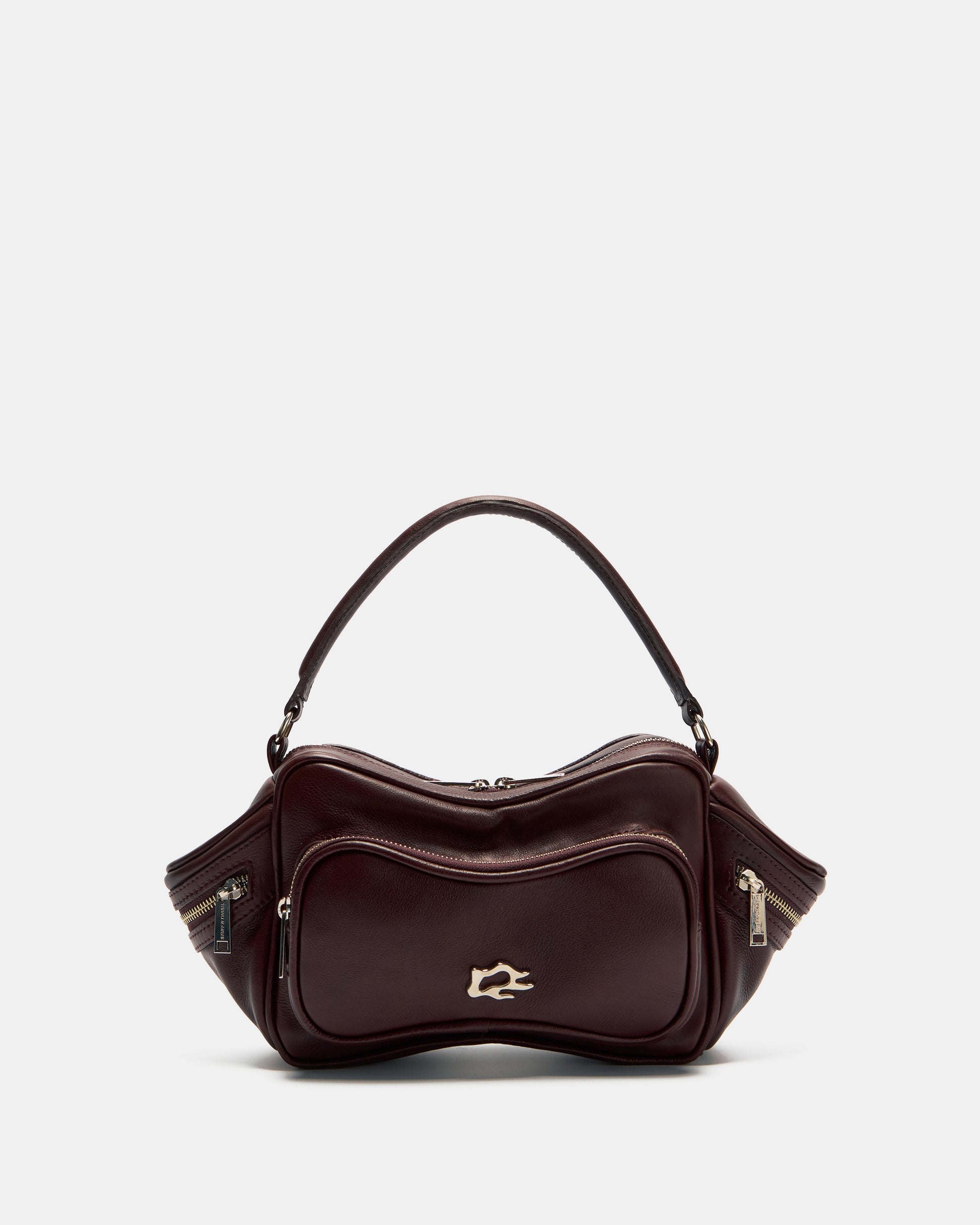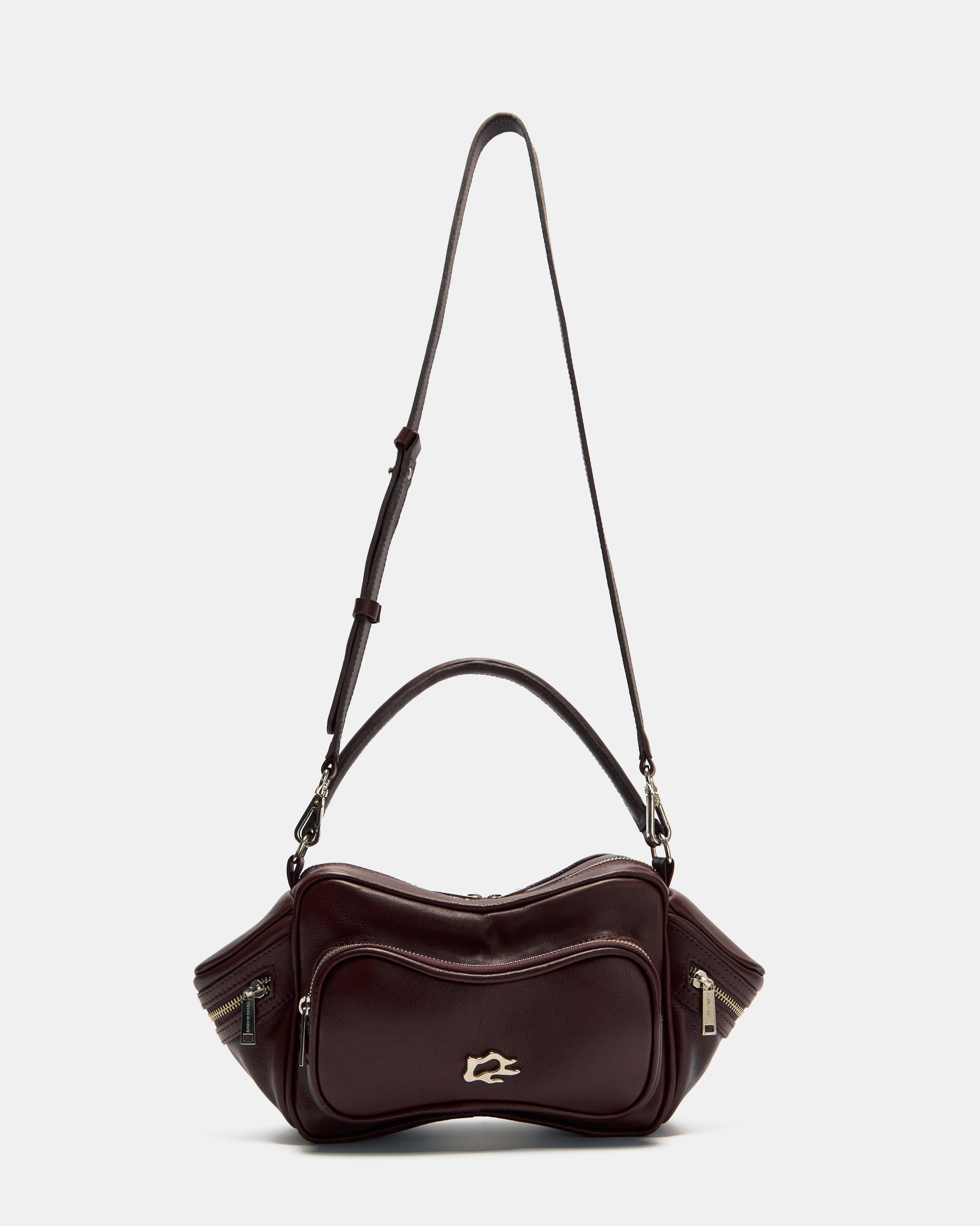 The Tool Mini Bag, crafted from brown cowhide leather, features multiple zippered pockets on the front and sides. It has a handle and a removable strap with a metal carabiner clip for crossbody or shoulder carry. The interior is lined in 100% black cotton and has a zippered pocket.