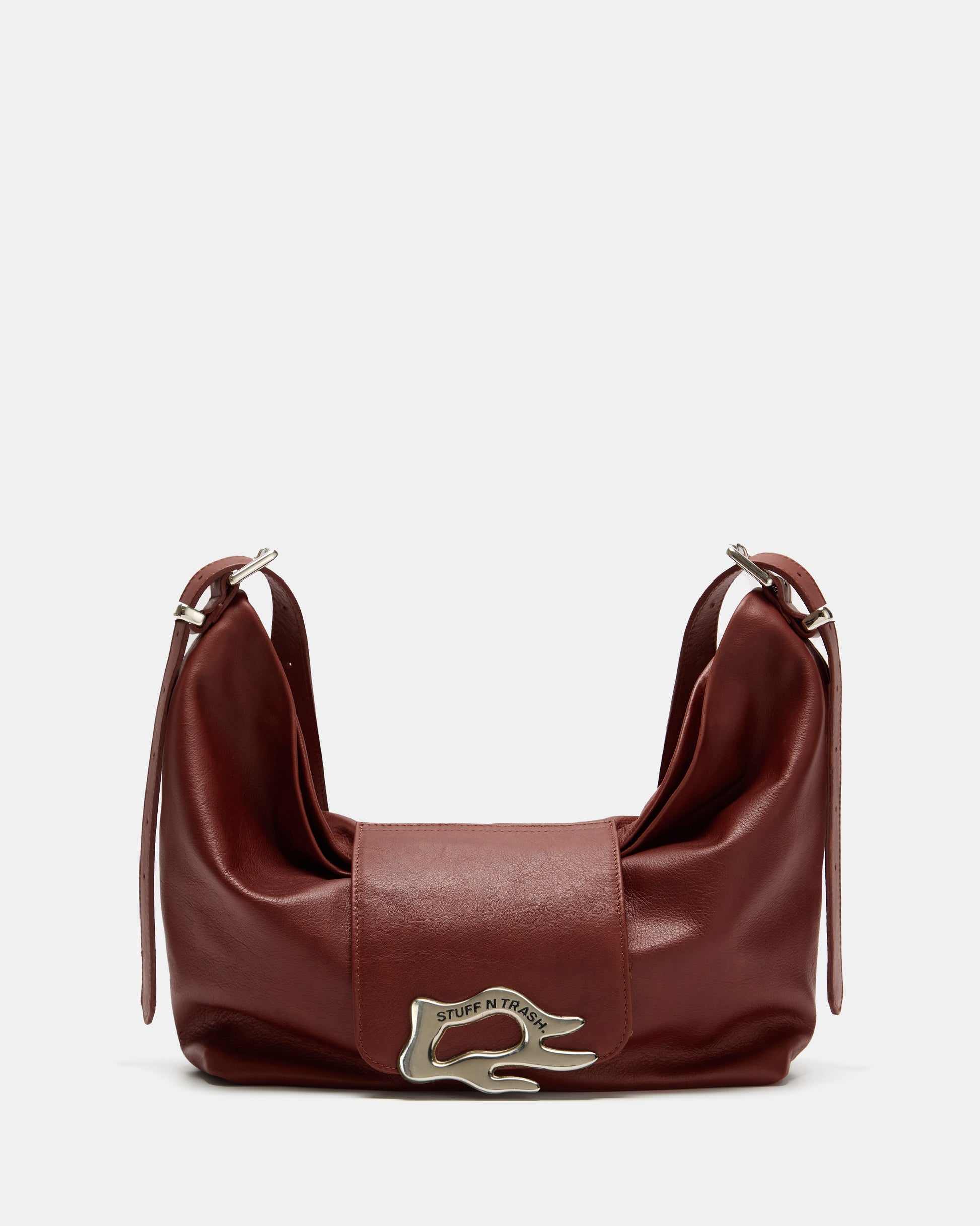 Brown cowhide leather bag with metallic appliqué. The strap is adjustable with two metal buckles on the sides, offering a total length of 120cm with 8 holes for your preferred fit. Access is via magnetic snap closure, featuring an interior pocket with metal zipper and black lining.