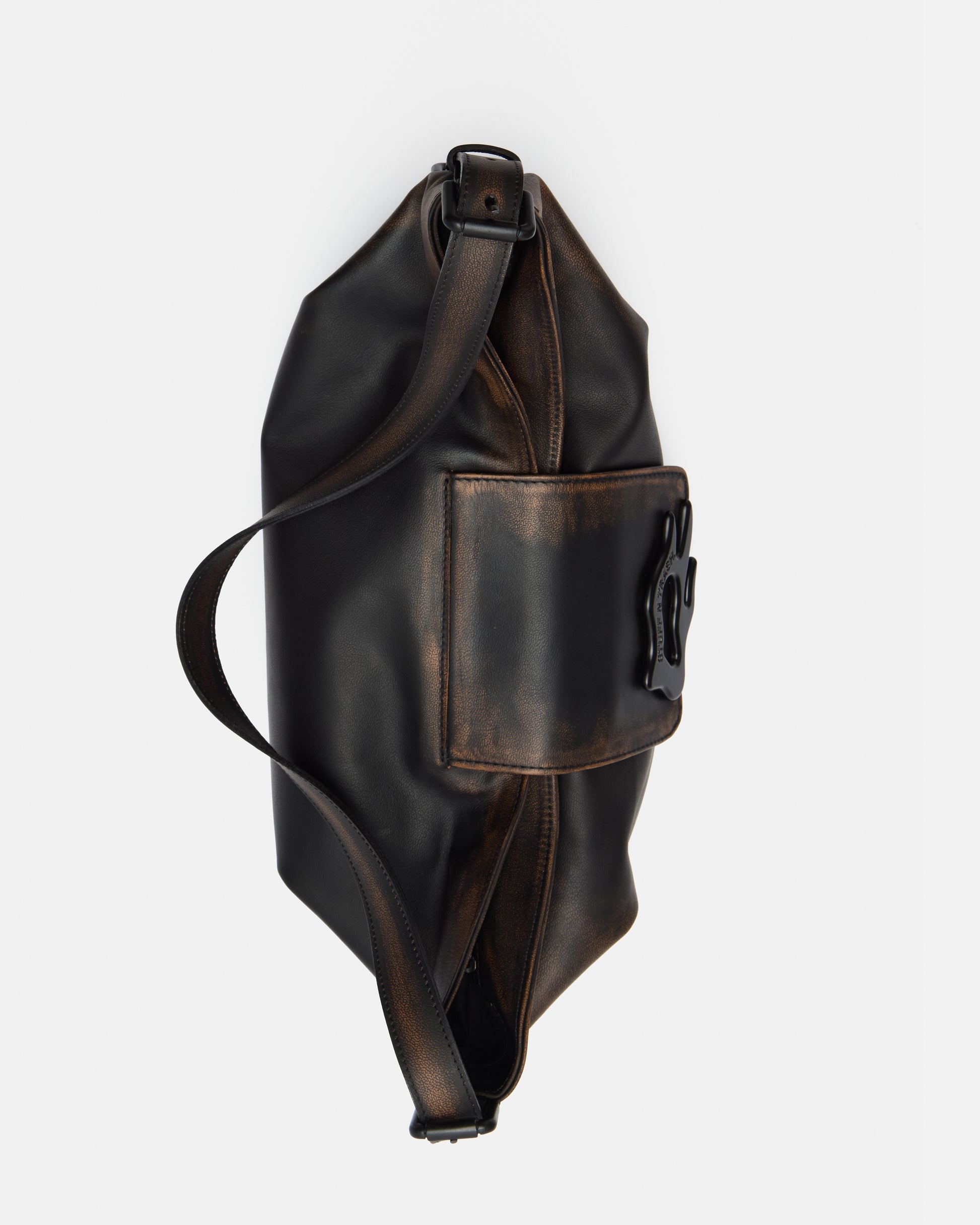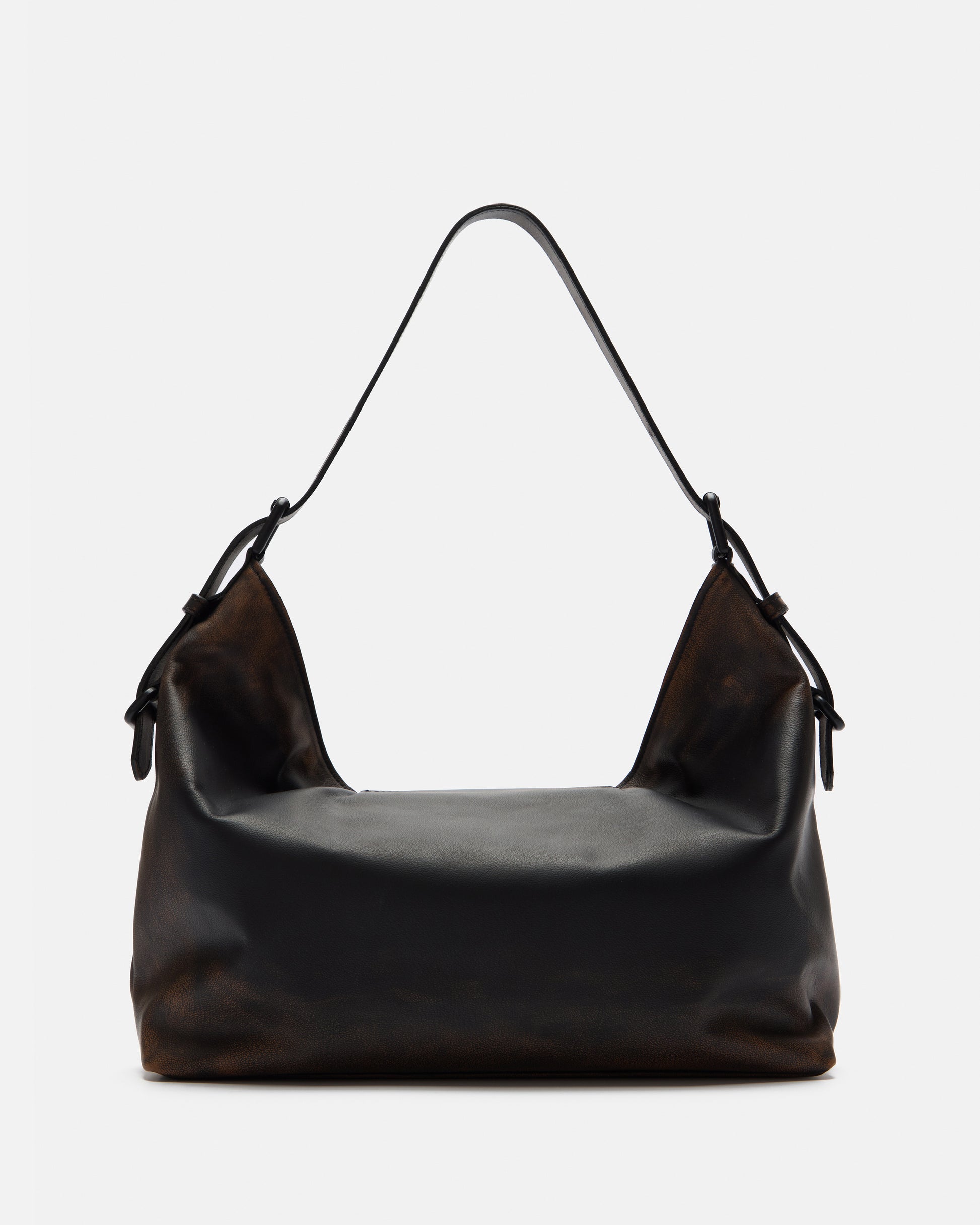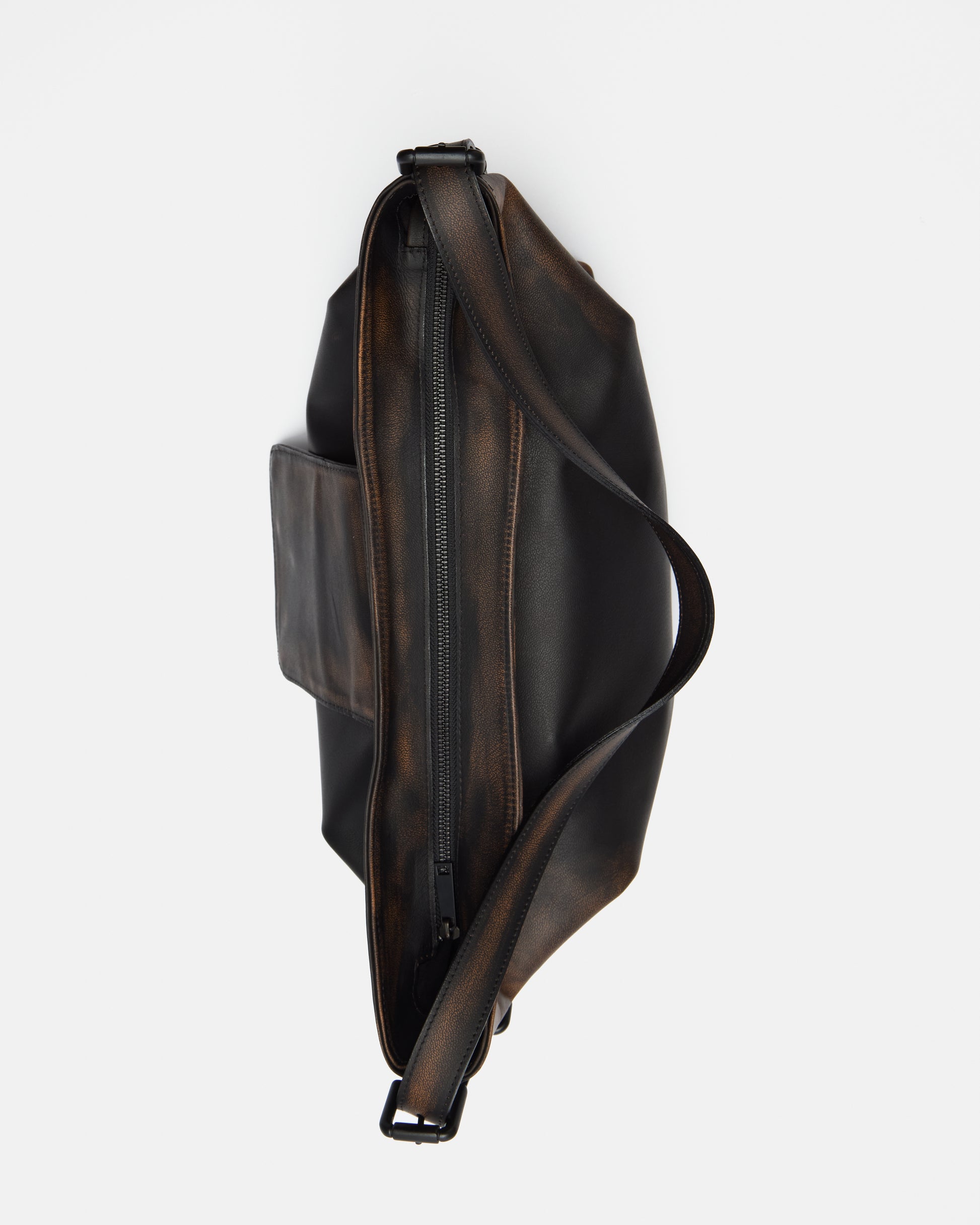 Veneno Zip Bag made from black cowhide leather with tinted brown finish. Includes two straps: a short one to carry on the shoulder and a long one to use as a crossbody bag, both adjustable to your preference. It has a metal zip closure and the interior is lined in 100% black cotton with a zip pocket.