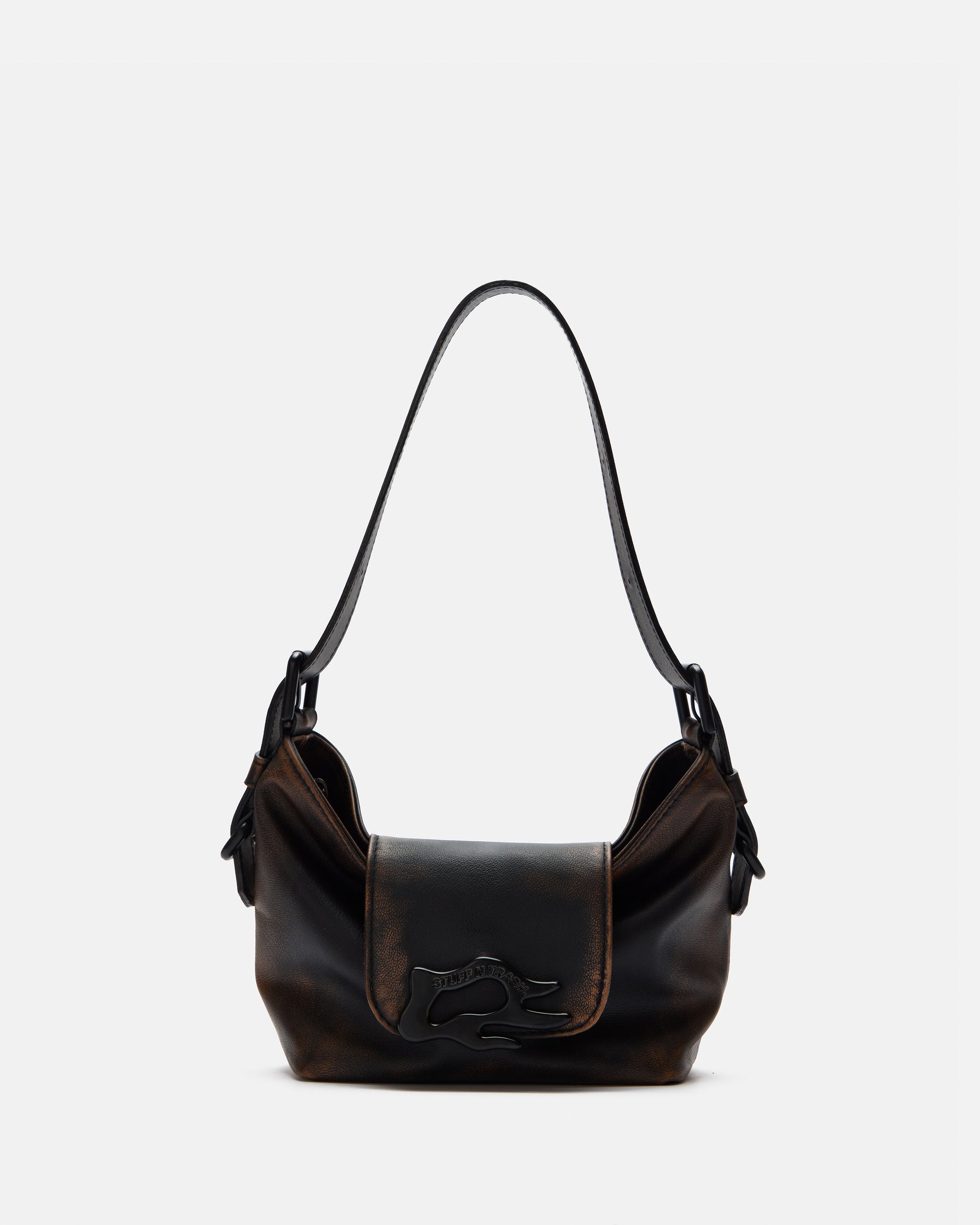 Veneno Zip Mini Bag made of black cowhide leather with tinted brown finish. Includes two straps: a short one to carry on the shoulder and a long one to use as a crossbody bag, both adjustable to your preference. It has a metal zip closure and the interior is lined in 100% black cotton with a zippered pocket.