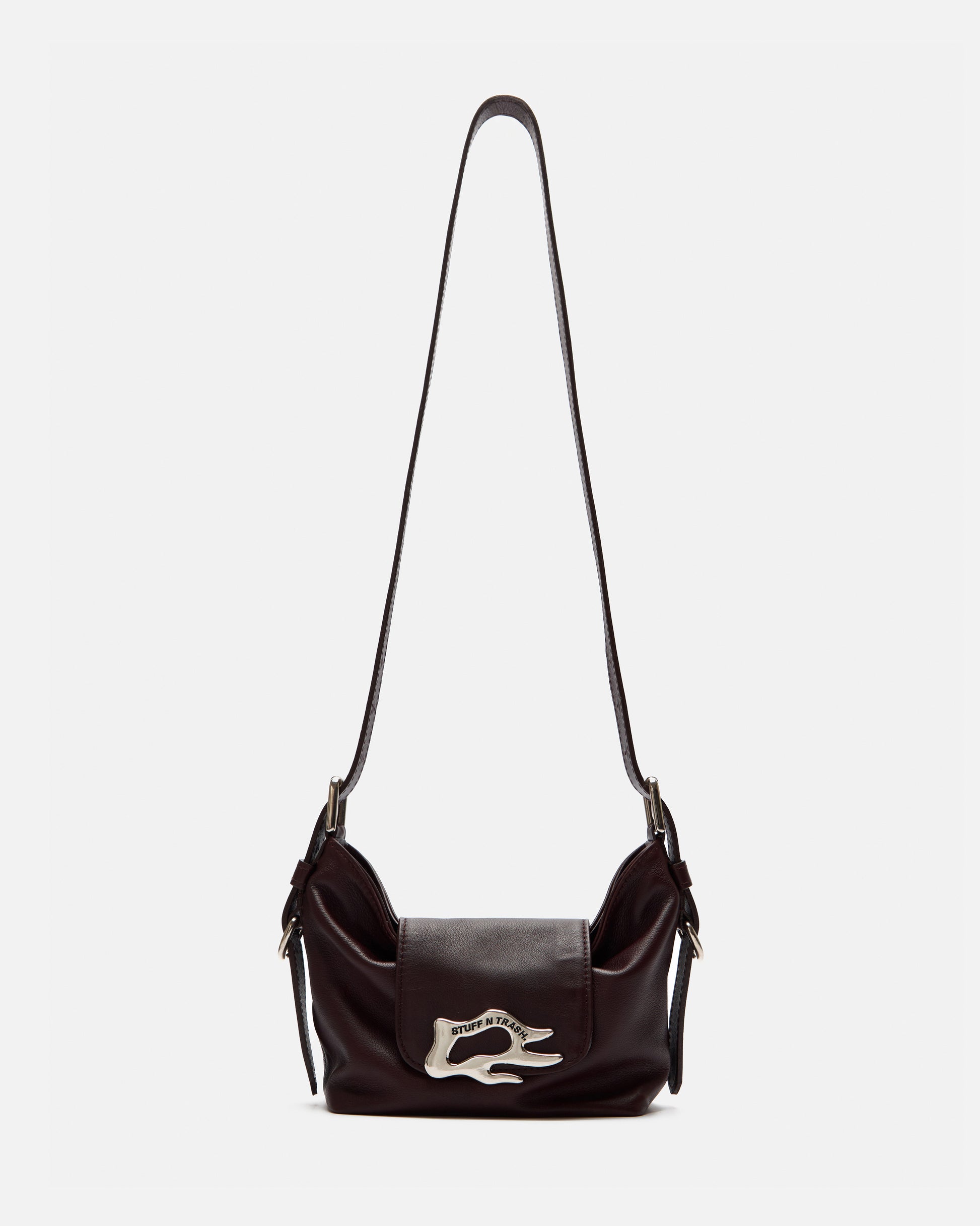 Veneno Zip Mini Bag made of chocolate brown cowhide leather. Includes two straps: a short one to carry on the shoulder and a long one to use as a crossbody bag, both adjustable to your preference. It has a metal zip closure and the interior is lined in 100% black cotton with a zippered pocket.